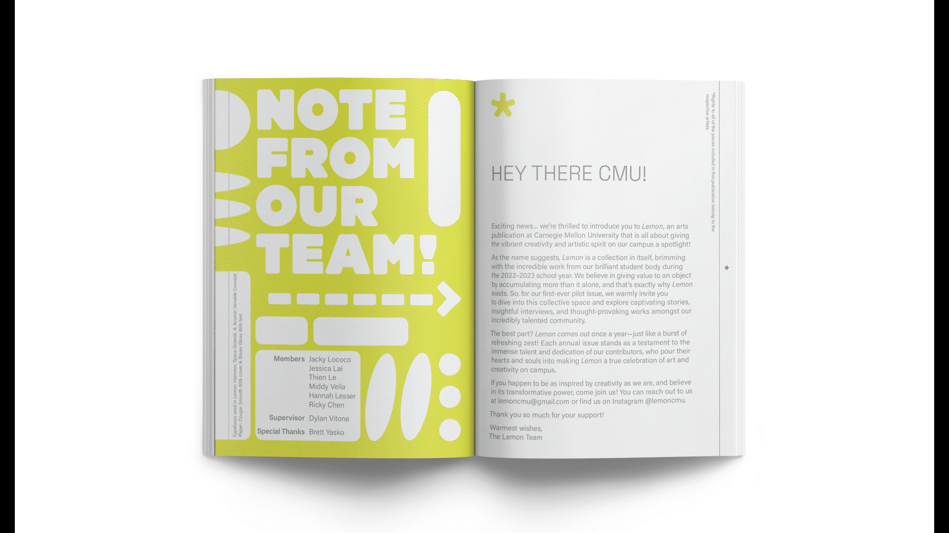 After my first year at Carnegie Mellon, a friend and I noticed a schism between the creative and scientific communities on campus, so we gathered a group of people interested in showcasing creative work and started Lemon Publication. Lemon showcases all the talented creatives, including writers, artists, performers, architects, and designers at Carnegie Mellon University through our print publication and social media.